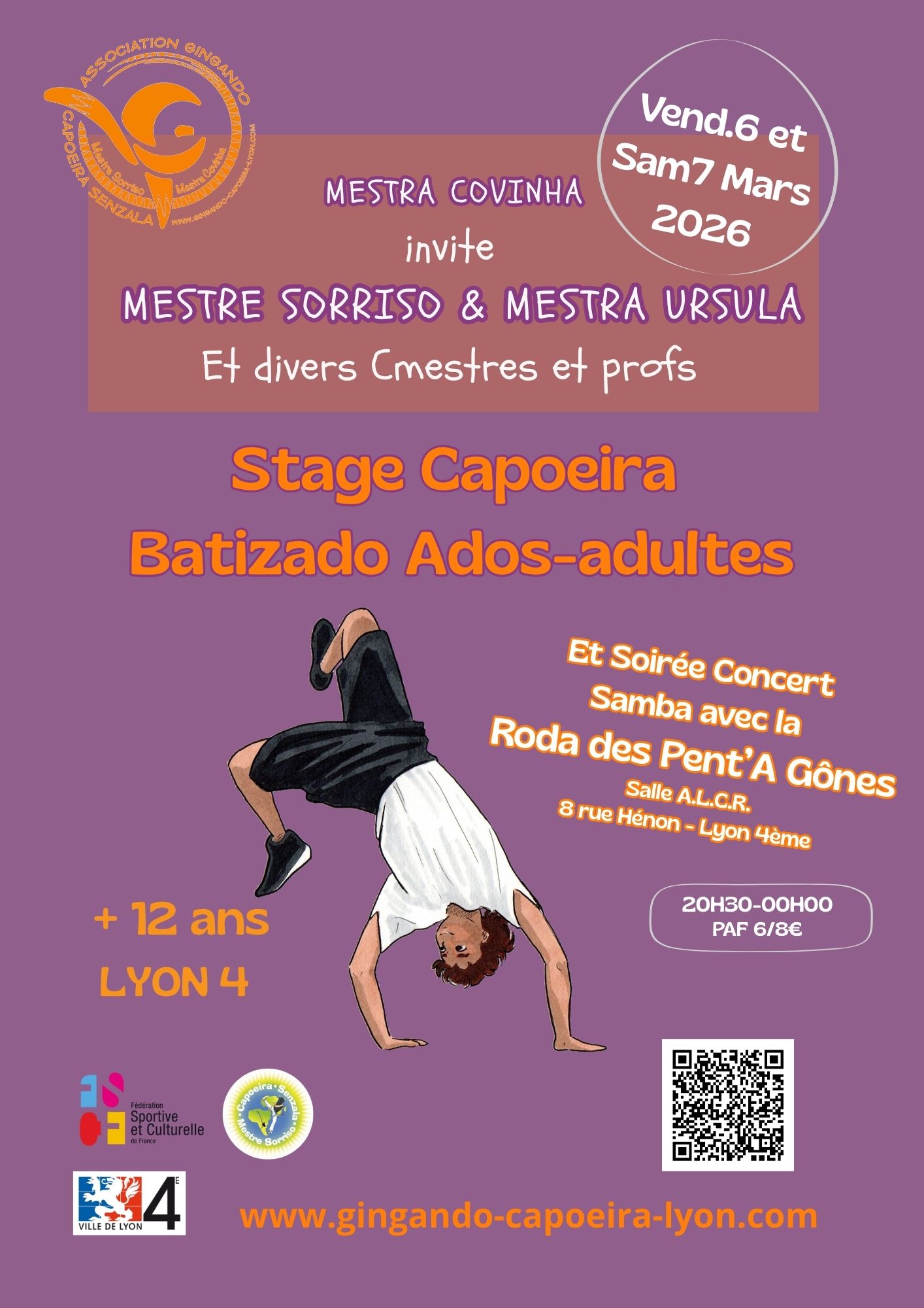Les 6 et 7 mars 2026, nous aurons le plaisir d’accueillir mestre Sorriso (Senzala Montpellier) et mestra Ursula (Senzala Paris) chez nous pour une soirée conviviale discussion et une journée de pratique de la capoeira pour tous les niveaux.